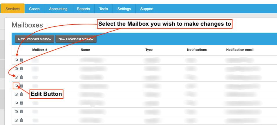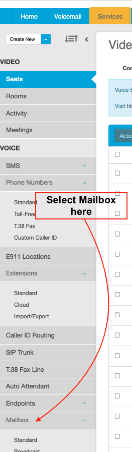 3. Once inside the Services Tab, select the Mailbox on the lefthand column menu.
